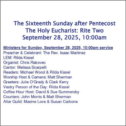 Service Schedule – Trinity Parish in Melrose https://trinitymelrose.org Welcome to The Episcopal Church. Welcome to Trinity Melrose. Fri, 03 Oct 2025 13:05:44 +0000 en-US hourly 1 https://wordpress.org/?v=6.9.3 https://trinitymelrose.org/wp-content/uploads/2025/06/cropped-Shield_of_the_US_Episcopal_Church.svg-e1750527276735-32x32.png Service Schedule – Trinity Parish in Melrose https://trinitymelrose.org 32 32 September 28, 2025 https://trinitymelrose.org/2025/10/03/september-28-2025/ https://trinitymelrose.org/2025/10/03/september-28-2025/#respond Fri, 03 Oct 2025 13:05:44 +0000 https://trinitymelrose.org/?p=1493